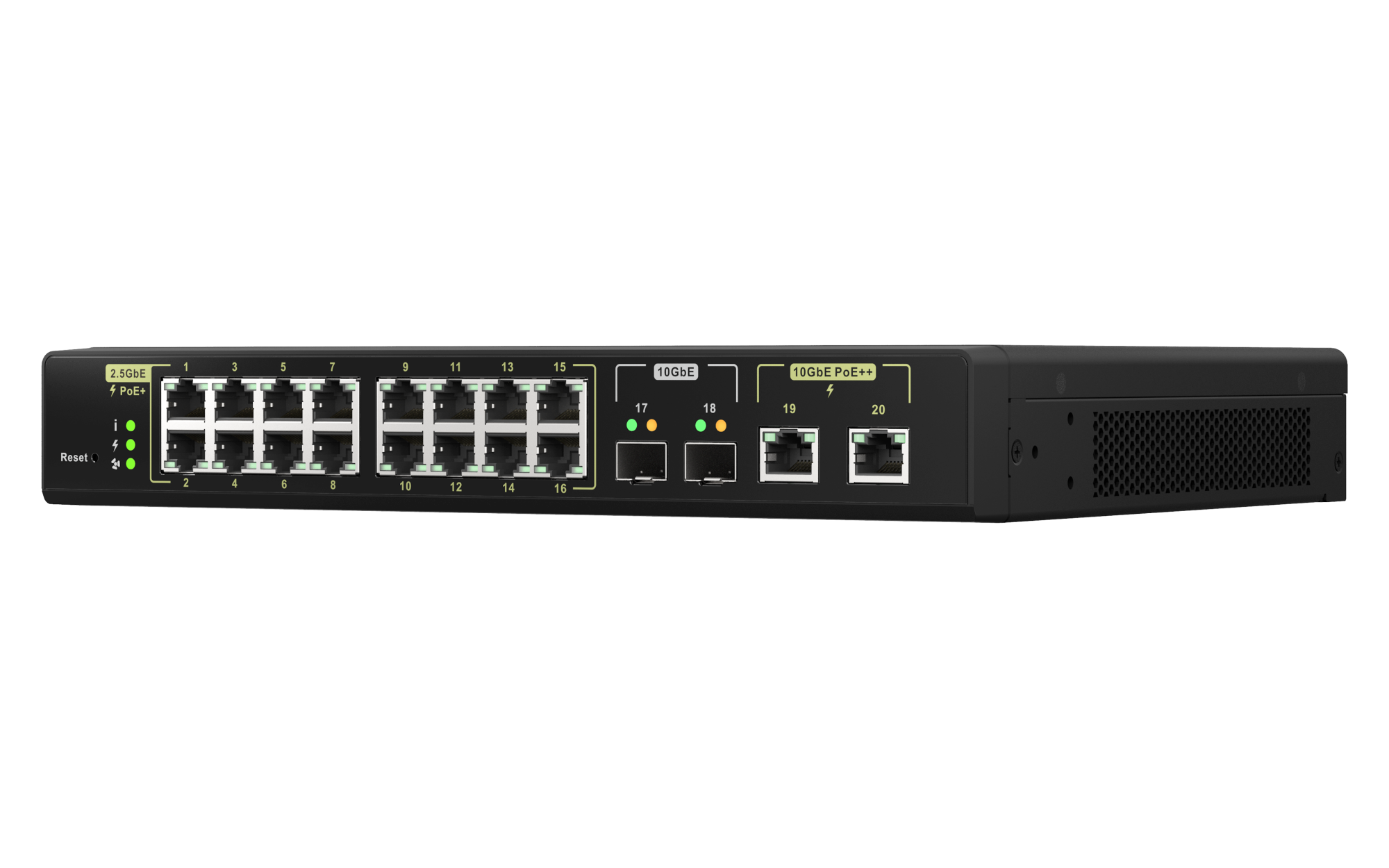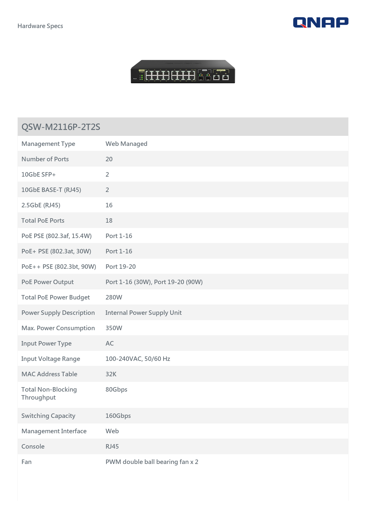 The QNAP QSW-M2116P-2T2S is a L2 PoE Managed Switch with sixteen 30-watt 2.5GbE PoE+ ports, two 90-watt 10GbE PoE++ ports. Offering a total power budget of 280 watts and two 10GbE SFP+ ports, the QSW-M2116P-2T2S not only enables a high-speed and high-power PoE network infrastructure for Wi-Fi 6 Access Points and Routers, but also provides backbone network uplinking capabilities. The QSS, QNAP Switch System with user-friendly web interface, helps IT administrators efficiently control Layer 2 and PoE networks, including wireless APs, IP Cameras and Digital Signage, core Switches and Servers. The QSW-M2116P-2T2S offers SMBs a cost-optimized and centrally managed LAN deployment solution. The QSW-M2116P-2T2S is made in Taiwan (MIT), providing a high-quality and reliable networking solution.