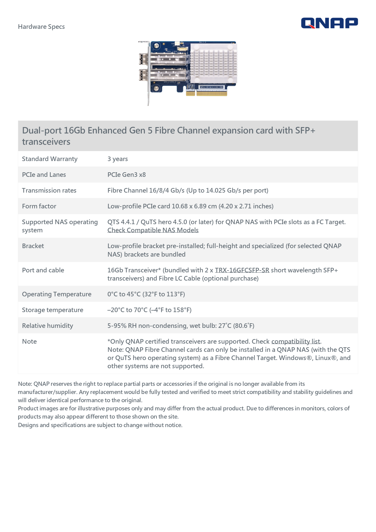 Common Fibre Channel SAN (Storage Area Networks) are closed network environments, and their devices are often expensive while lacking deployment flexibility. QNAP introduces dual-port 16Gb/32Gb Fibre Channel expansion cards that feature high performance, reliability, security, and energy efficient Fibre Channel. With a QNAP Fibre Channel card in your QNAP NAS, your NAS can be added to an existing SAN environment at an affordable price point to fulfill requirements for high-performance storage and backup.