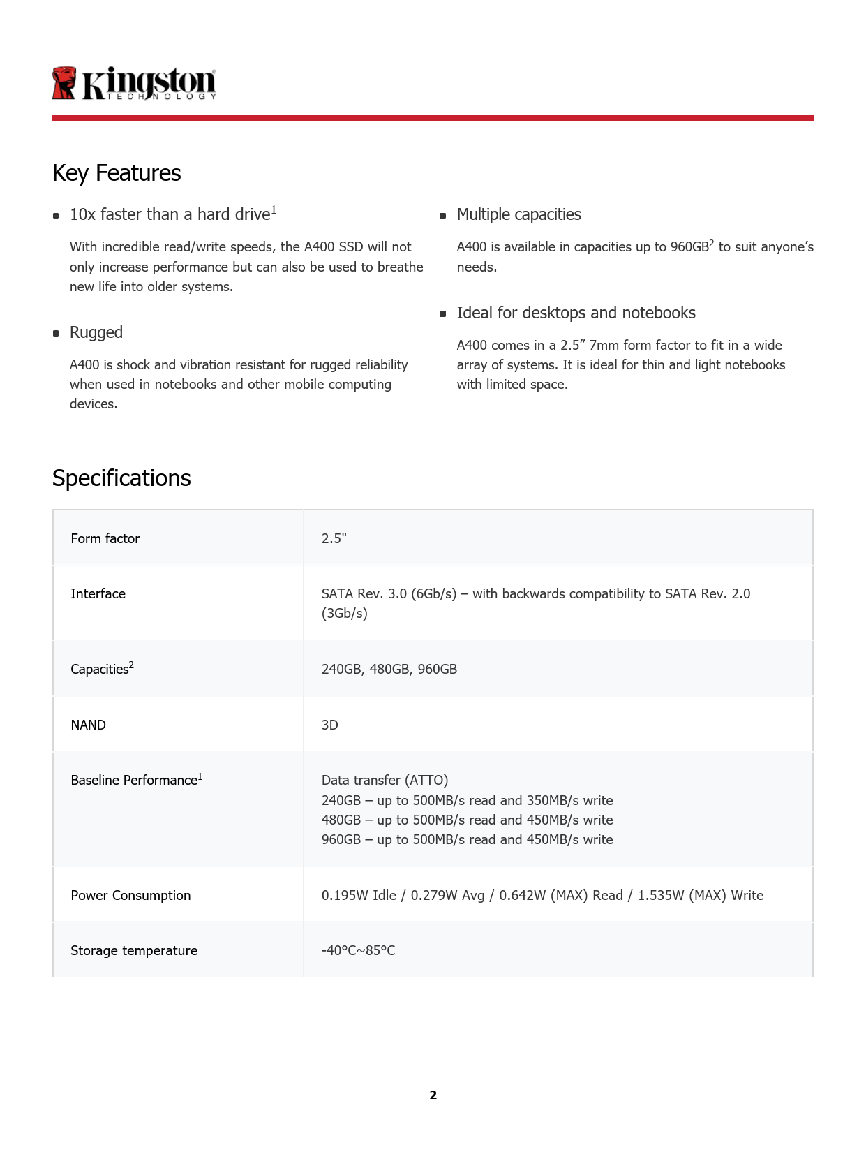 Kingston’s A400 solid-state drive is ten times faster than a standard hard drive, boasting slick boot, loading and transfer times with read and write speeds of up to 500MB/s and 450MB/s. With none of the failings of a mechanical hard drive, the durable A400’s shock and vibration resistance make it perfect for laptops and other mobile computers.