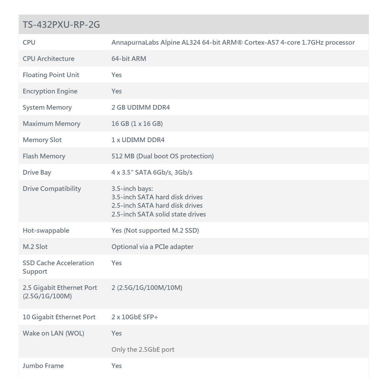 | CPU | AnnapurnaLabs Alpine AL324 64-bit ARM® Cortex-A57 4-core 1.7GHz processor |