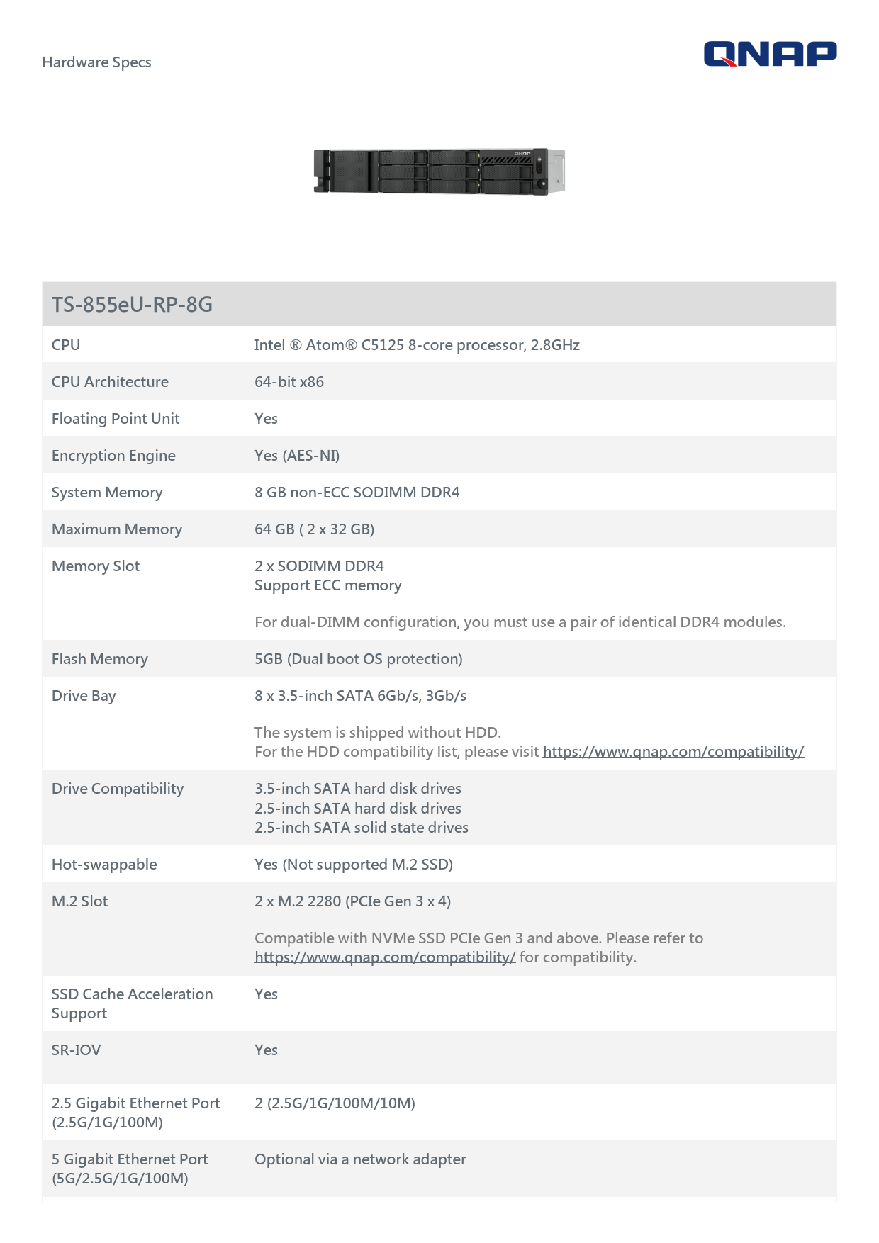 Designed for flexible IT deployment and comprehensive virtualization applications, the short-depth TS-855eU-RP 2.5GbE NAS can easily fit in a compact rack in offices or audiovisual rooms. Powered by an Intel® 8-core processor, the TS-855eU-RP packs excellent performance and computing benefits to empower fast data access, backup/restoration, file server, and virtualization applications, while including redundant power supplies to ensure maximum system uptime. Running the QTS operating system as standard, the TS-855eU-RP can be switched to use the ZFS-based QuTS hero operating system based on your requirements. The TS-855eU-RP will be available and supported by QNAP for an extended period (up to 2030) , ideal for businesses requiring matching NAS models deployed for long-term projects.
