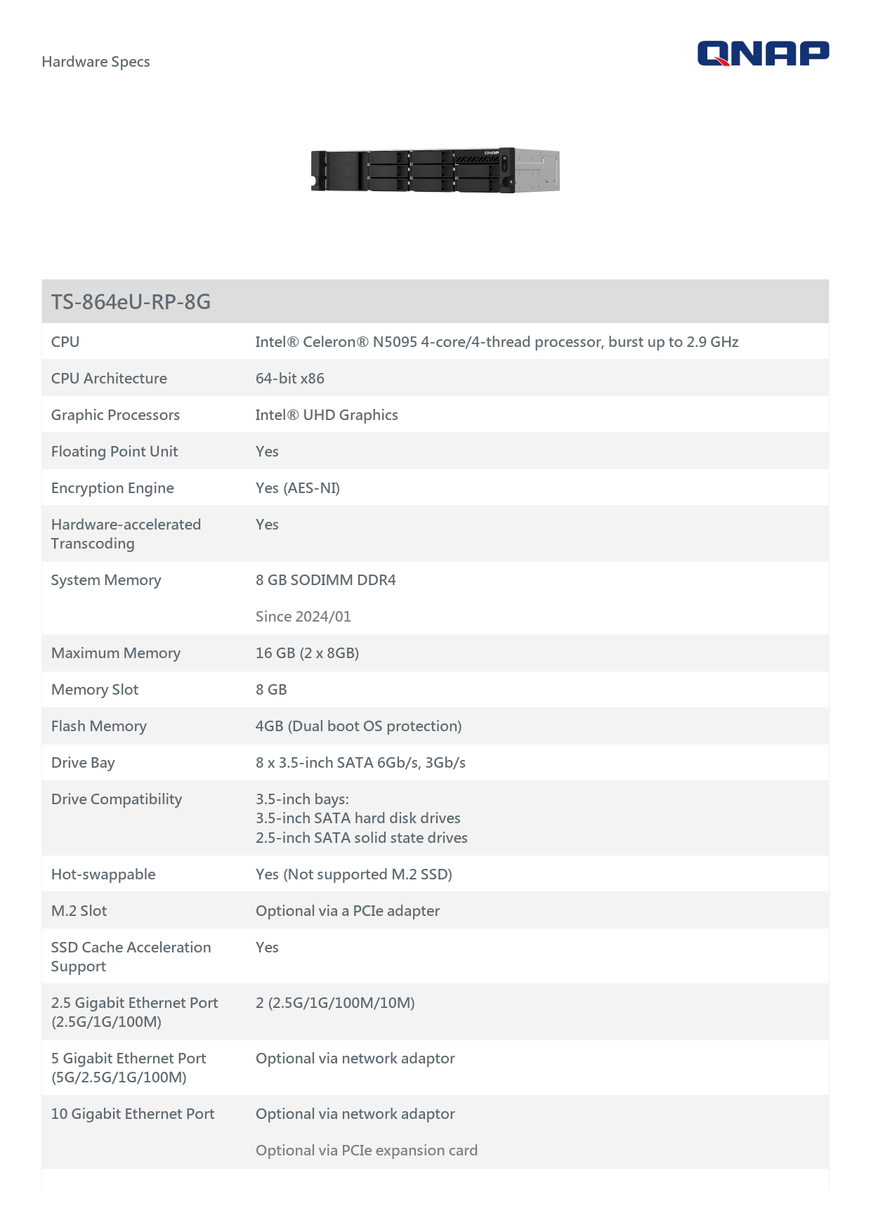 The TS-864eU-RP is powered by Intel® Celeron® N5095 quad-core processor (burst up to 2.9 GHz). The space-efficient short depth design makes it easy to install in small media cabinets or places with a lot of cabling. With expandable storage capacity and feature-rich apps, the TS-864eU-RP surpasses the previous generation.